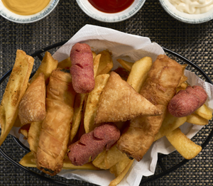 Sosis, patates, sigara böreği ve üçgen çin böreği