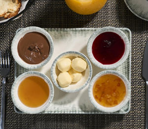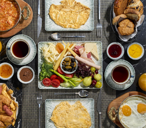 Domates, salatalık, biber, beyaz peynir, yeşillikler, eski kaşar, ezme peynir, çeçil peynir, çörek otlu peynir, hindi füme, dana jambon, kuru kayısı, ceviz, mevsim meyveleri, tereyağı, bal, çilek reçeli, kayısı reçeli, çikolatalı fındık ezmesi, iki çeşit zeytin, patates tava, sosis, sigara böreği, çin böreği, simit, ekmek, menemen ve omlet çeşitleri