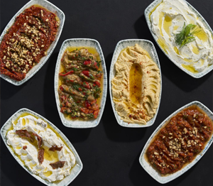 Haydari, humus, acılı ezme, manca, muhammara, közlenmiş patlıcan salatası